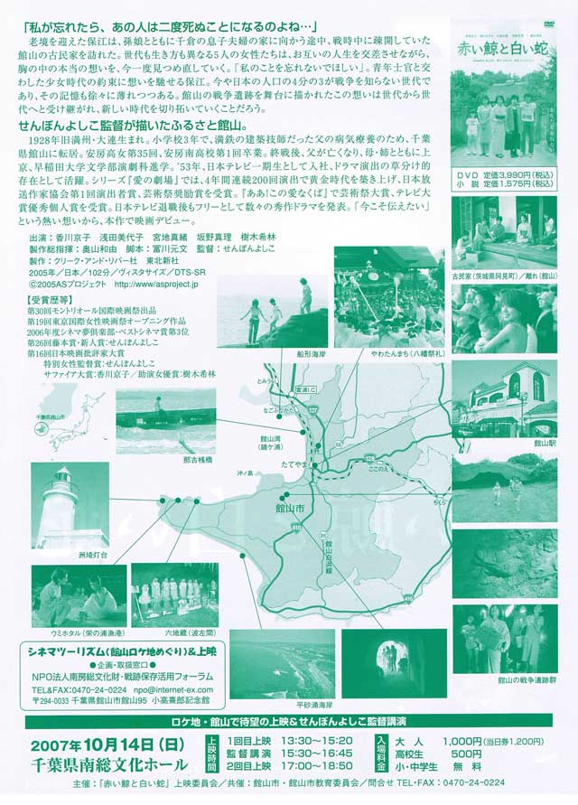 南房総・館山を舞台にした映画『赤い鯨と白い蛇』が誕生しました。「赤い鯨」は軍都だった館山の沖で訓練をくりかえす特殊潜航艇(特攻の潜水艦)を意味し、「白い蛇」は家の守り神を象徴しています。戦時中の館山で安房高女(安房南高校)の学生だったせんぼんよしこ監督が、女性の目線から平和と命を描いた美しい作品です。戦時中館山に疎開していたという設定の香川京子さんをはじめ、世代の異なる5人の女性たちが、人と人との絆が薄れつつある現代社会のなかで、「自分に正直に生きる」ことの難しさと大切さを伝えてくれています。何度も鑑賞するたびに、新鮮な気づきと感動がある、味わい深い作品です。